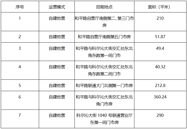 中国联合网络通信有限公司通辽市科尔沁区分公司通过公开招商方式引入有实力的社会渠道,采取“自建他营”的方式开展第三方运营,创建通辽地区具有重要营销力的联通合作,针对即将到期的联通合作商,经分公司研究决定开展合作招商工作,本次招商投入方式为由引入方对原有营业厅进行装修改造,房屋产权归中国联通所有,具体内容如下: